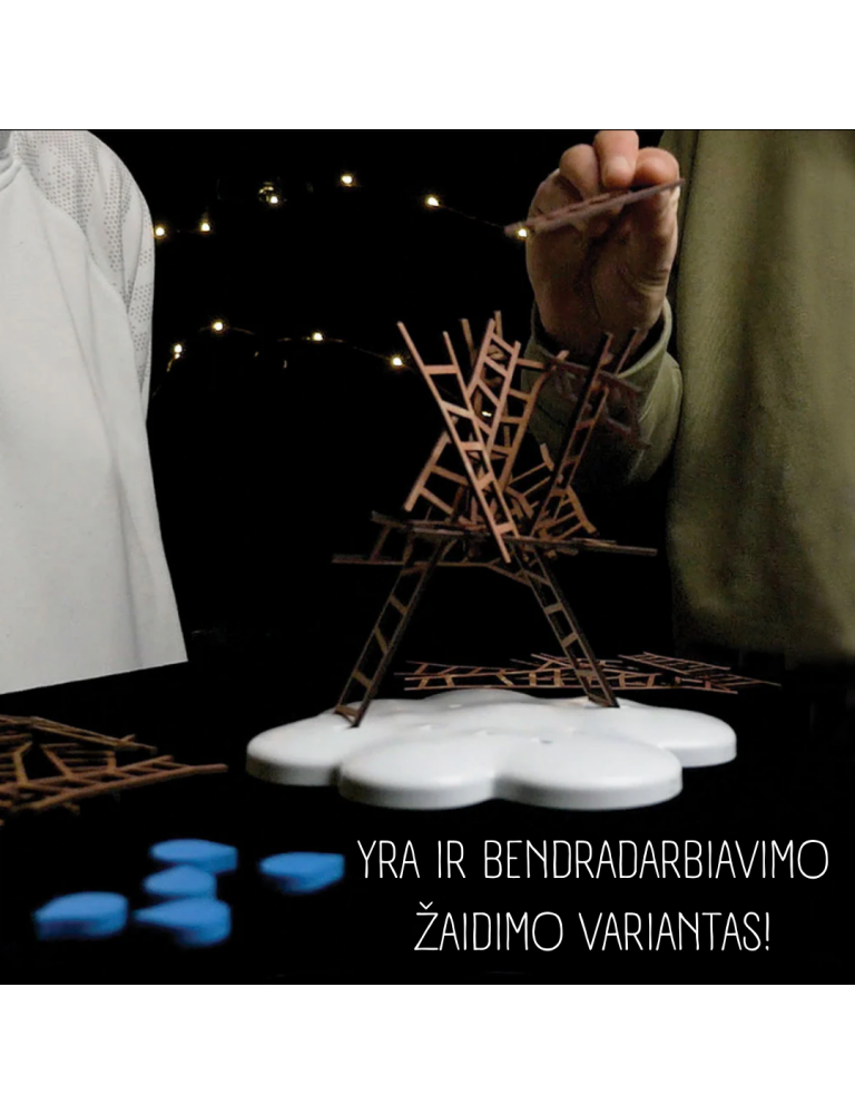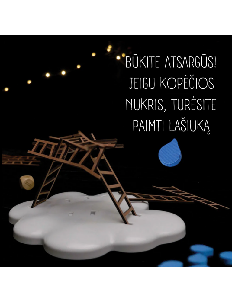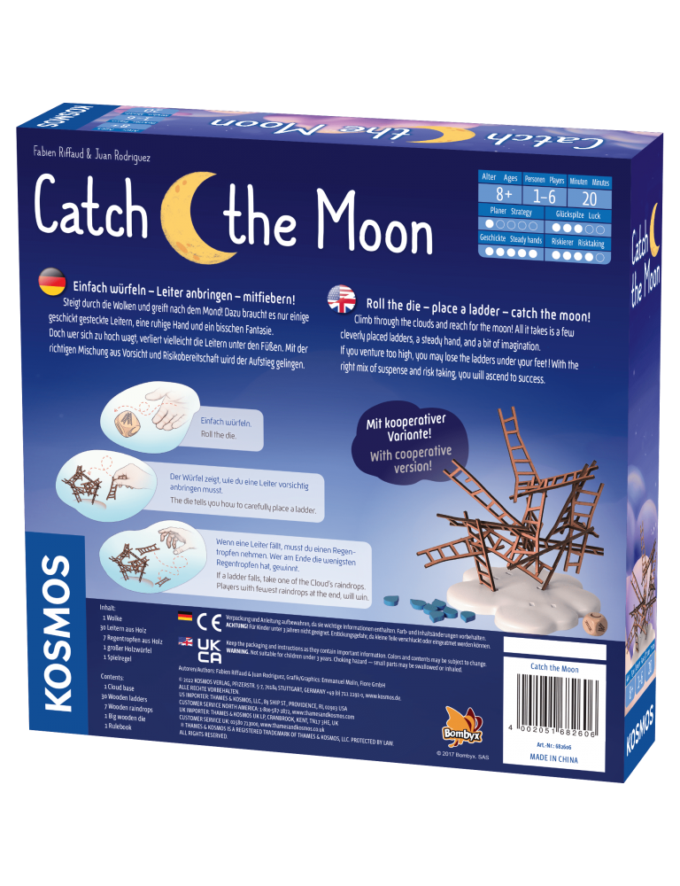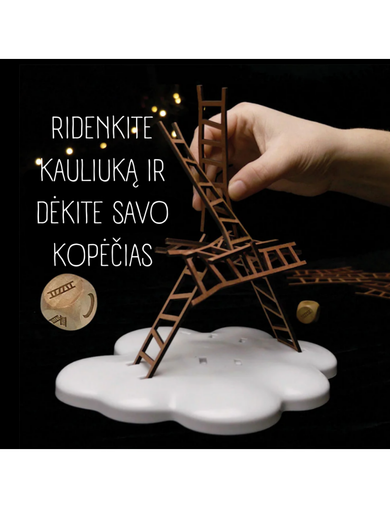 Uzkāp pa kāpnēm un sasniedz mēnesi! Viss, kas tev nepieciešams, ir dažas prasmīgi novietotas kāpnes, droša roka un nedaudz iztēles. Met kauliņus, novieto kāpnes secībā, kas parādīta uz kauliņiem (kāpnēm jāpieskaras citām kāpnēm vai divām citām kāpnēm utt.). Jo vairāk kāpņu, jo neparedzamāka kļūst spēle.