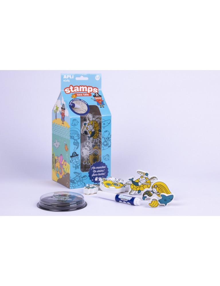Skaists okeāna tematikas zīmogu komplekts ar dzēšamu tinti radošām spēlēm. Mazie nākotnes varoņi varēs radīt pasakas, izvietojot ar tiem zīmogus, dekorējot lapas vai piezīmju grāmatiņas.
