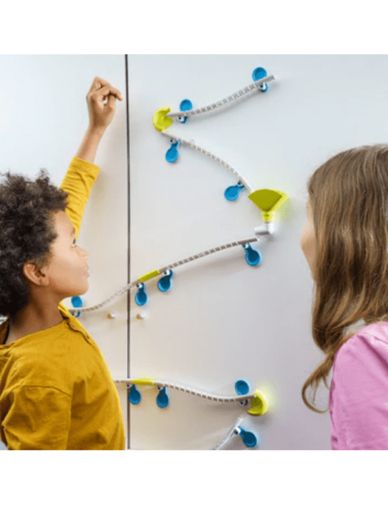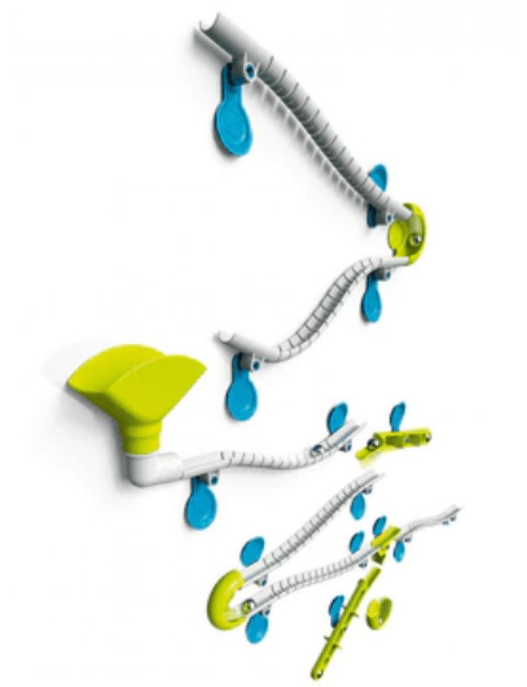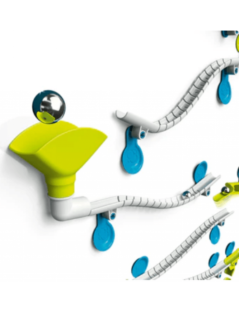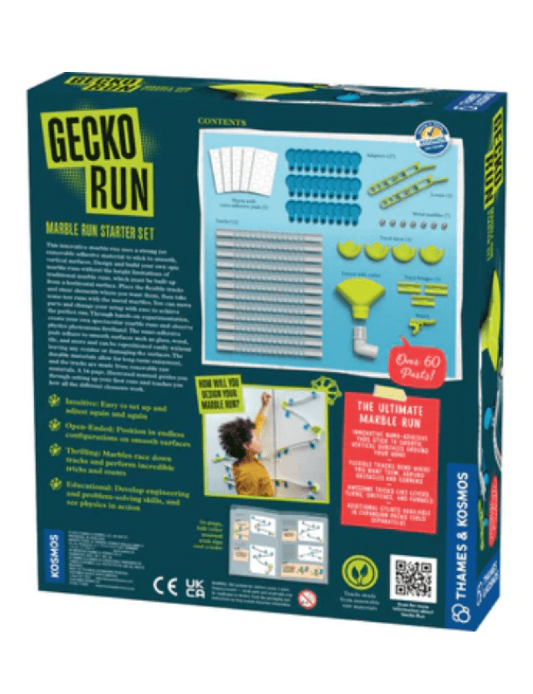 GECKO RUN komplekts paceļ jaunos prātus pilnīgi jaunā konstruēšanas un eksperimentēšanas līmenī, sniedzot jaunus radošus izaicinājumus. Šī inovatīvā bumbu ripināšanas trase izmanto speciāli izstrādātu elastīgu sliežu sistēmu, kurai nav nepieciešamas nekādas atbalsta konstrukcijas. Tāpēc trases var veidot, izmantojot jebkuru gludu virsmu – durvis, logus, skapi, grāmatu plauktus – galu galā viss kļūst par trases daļu.
