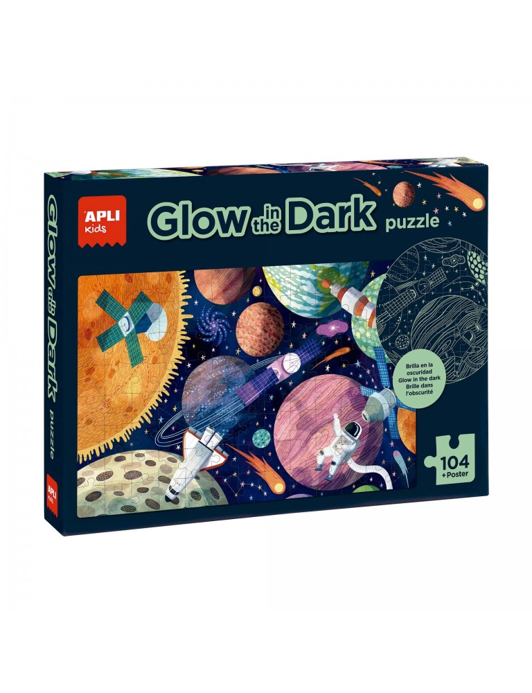 Kastes iekšpusē atradīsiet plakātu pašas puzles lielumā, kas atvieglos puzles salikšanu. Pēc puzles salikšanas apgaismojiet to ar spēcīgu gaismas avotu, un pēc dažām minūtēm jūs varēsiet redzēt planētas, zvaigznes un astronautu dzīvniekus, kas peld tumsā.