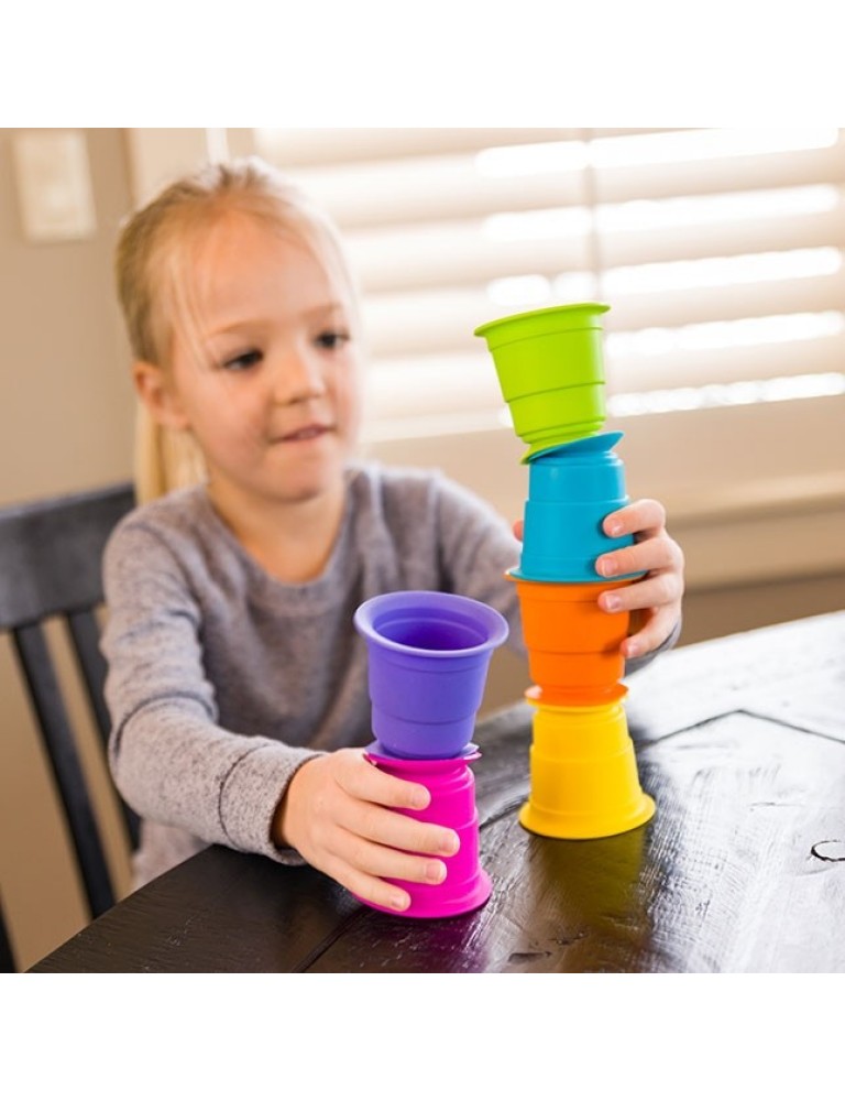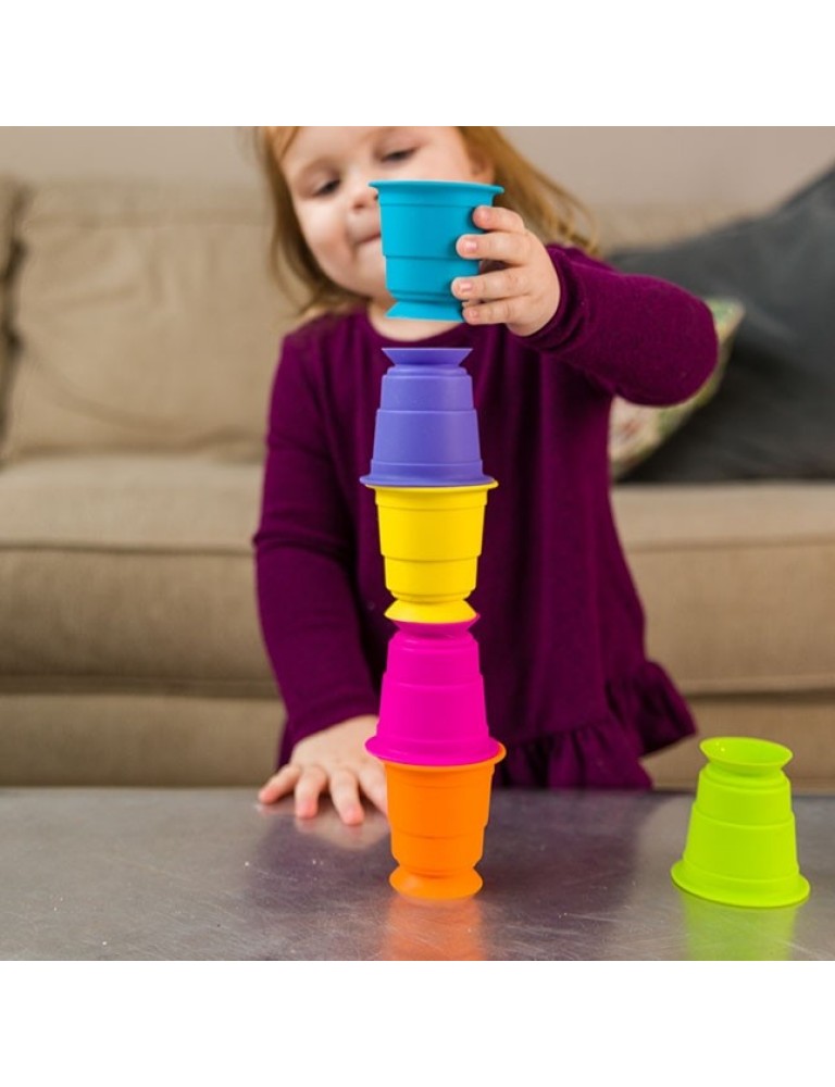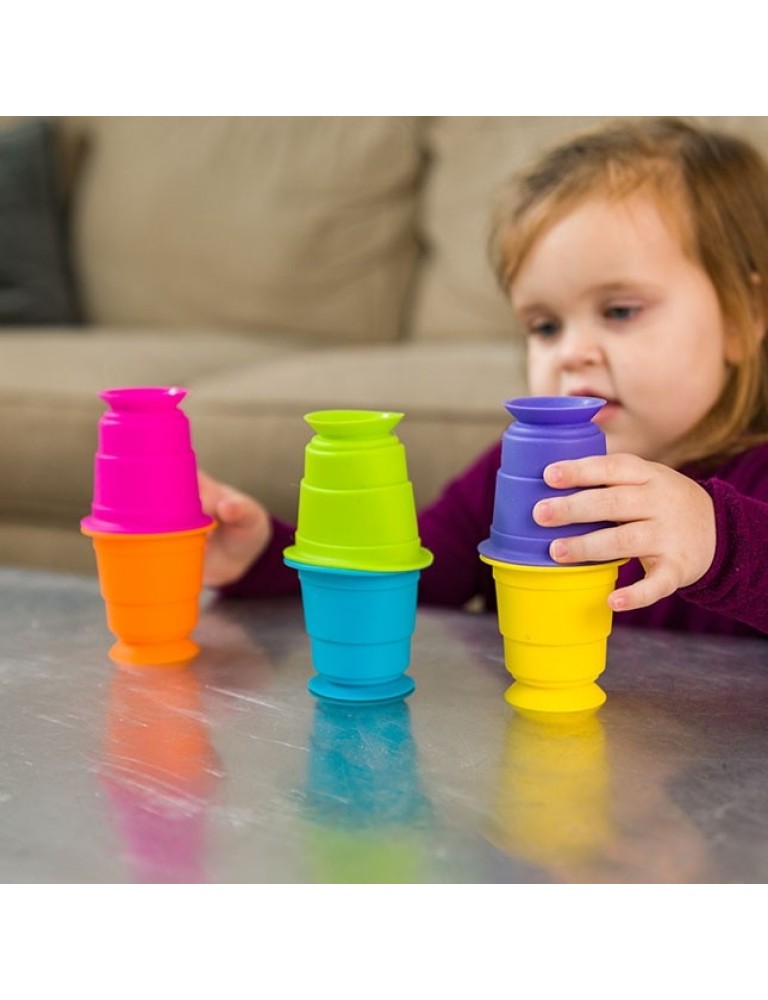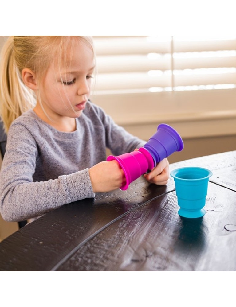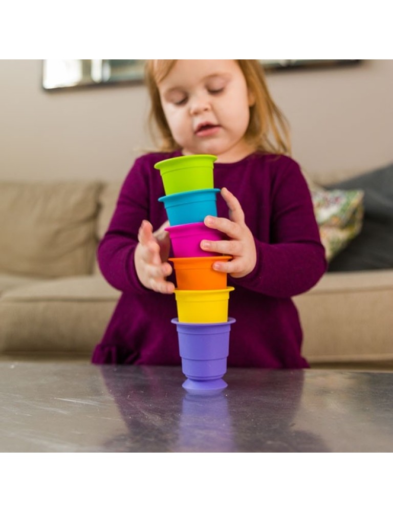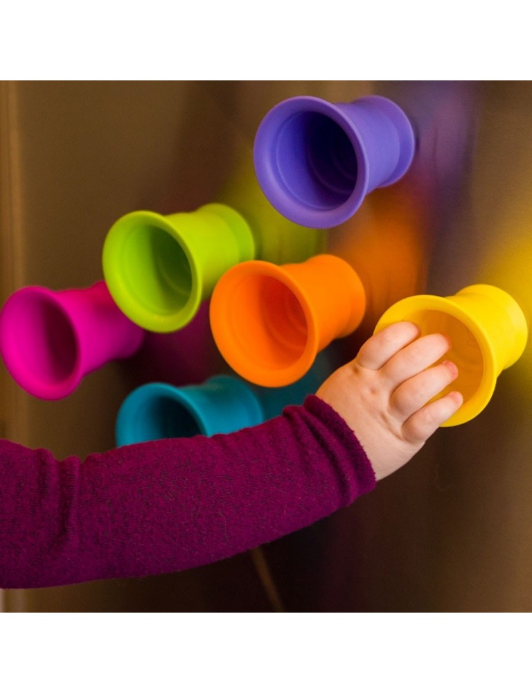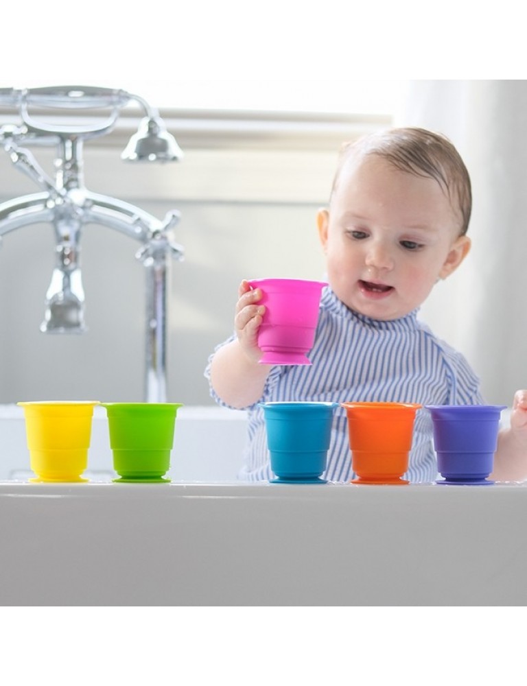 Katram no šiem krāsainajiem krūzīšu apakšas veidotājiem ir apakša, kas pielīp pie dažādām gludām virsmām, un augšdaļa, kas pielīp pie krūzītes. Neatkarīgi no tā, kā jūs tos novietojat, katra krūzīte paver bezgalīgas iespējas spēlēm un radošumam. Ņemiet tos līdzi vannā, lai smeltu un liet ūdeni, vai arī peldiniet krūzītes virs ūdens.