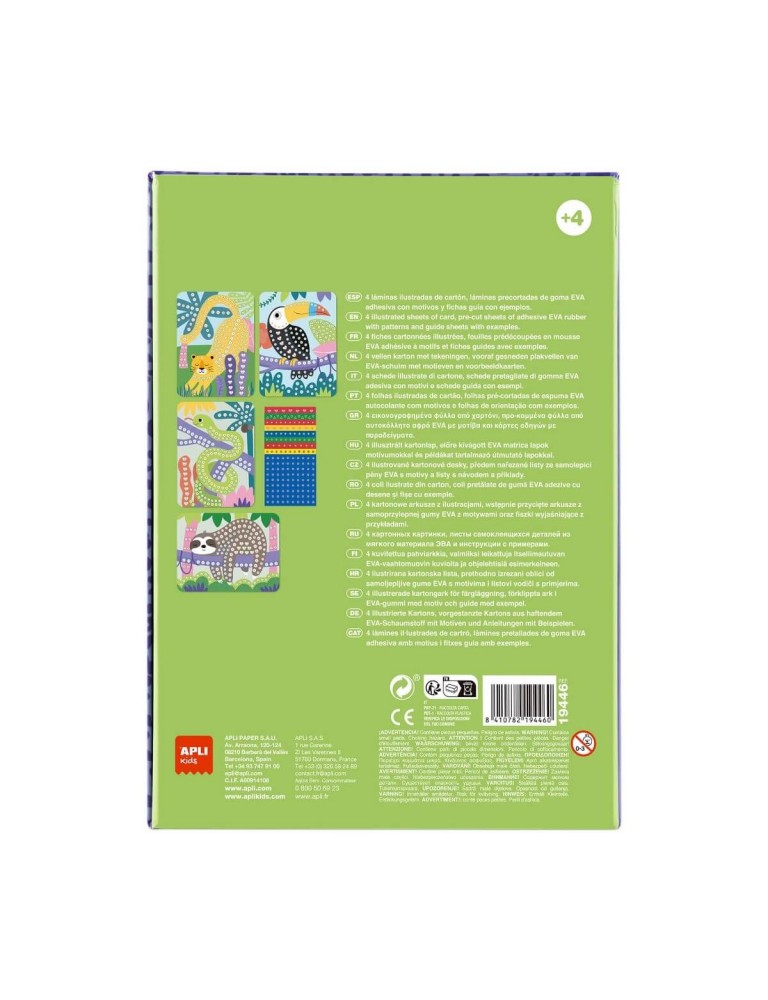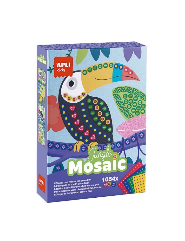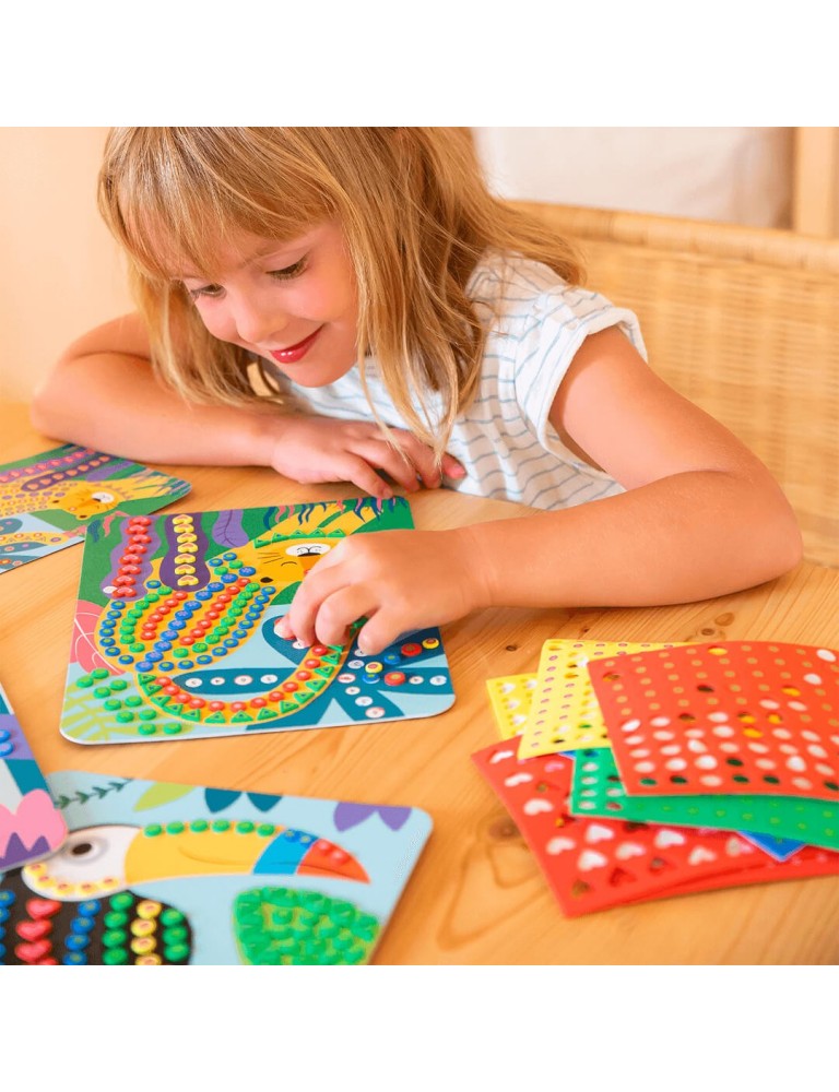 Radoša spēle mozaīku veidošanai ar pašlīmējošām, iepriekš sagrieztām EVA putām dažādās krāsās un tekstūrās. Džungļu tematikas komplekts ļauj bērniem viegli veidot krāsainus attēlus, attīstot smalko motoriku, roku-acu koordināciju un telpisko uztveri.